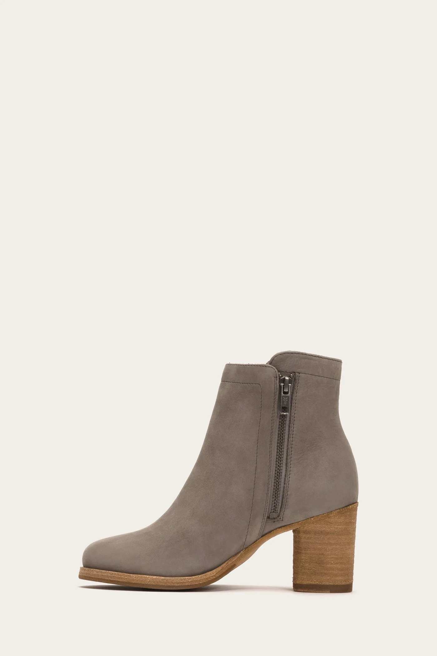Effortless moto style. Handcrafted from soft tumbled Italian nubuck leather, this bootie offers a comfortable mid heel and round-toe silhouette that lend a casual touch to the irresistible cool of its double-zip design. - Italian leather