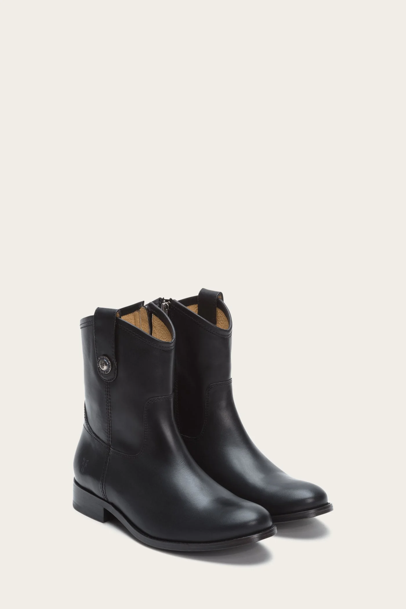 Everyone's favorite the Melissa just got a little sister. Made of smooth vintage leather and accented with our signature button, these short boots are testimony to our legacy of craftsmanship. From thrift shop treasures to runway-ready looks, you can pair absolutely anything with these boots. - Italian leather- Leather lined- Leather outsole- 6 1/2" shaft height- 11 1/2" shaft circumference- 1" heel height